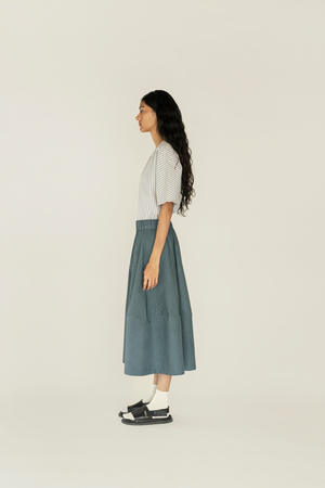 A handwoven skirt crafted from 100% organic cotton. Features inseam pockets, unlined construction, and a fully elasticated waist. Made in India. Model is 5'8 and wearing a small/medium size. Approximate measurements (in inches): Xsmall: Length - 30.5", Waist - 26" Small/Medium: Length - 31", Waist - 28" Large: Length - 31.5", Waist - 30"