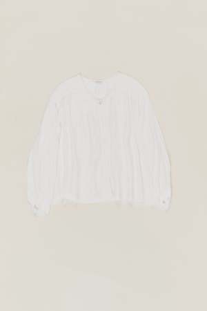 Crop blouse from Runaway Bicycle in a lightweight handloomed silk. Hidden full button front with gathered embroidered shoulders and button cuffs. Relaxed through the body with an easy, airy drape. Composition: 100% handloomed silk. Made in India.