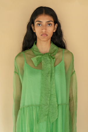 The lightness of a touch can say what words cannot express. This sheer dress in organza floats around like thoughts that arrive on days with time to spare. A sheer dress | 100% organza silk - Comfort fit - Slip included - Made in India - Model is 58 and wearing a small/medium size The colour in the photograph may vary slightly from the actual product as it is shot in natural light. GARMENT MEASUREMENTS Small/Medium: Length: 47", Chest: 48", Shoulder: 23.5" Large: Length: 47.5", Chest: 50", Shoulder: 24" *Please note these are the approximate measurements in inches. All the products are handcrafted and the measurements may vary a little due to its handcrafted nature.