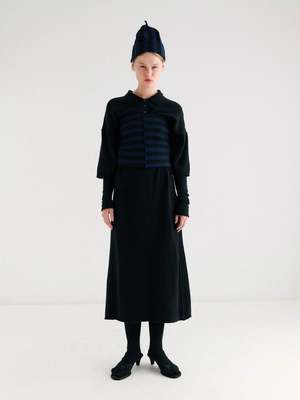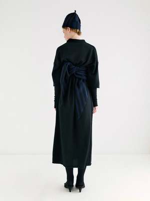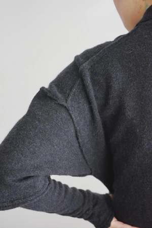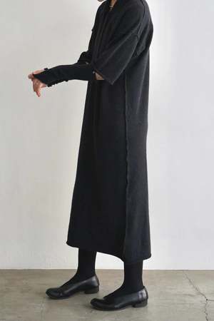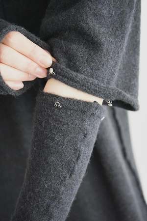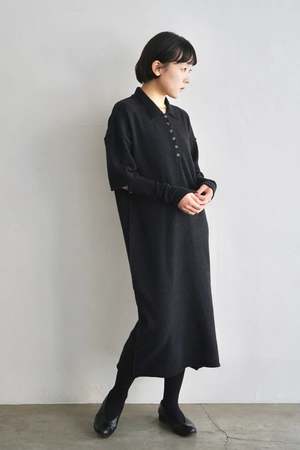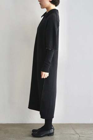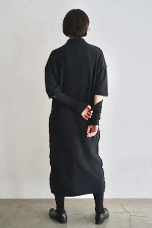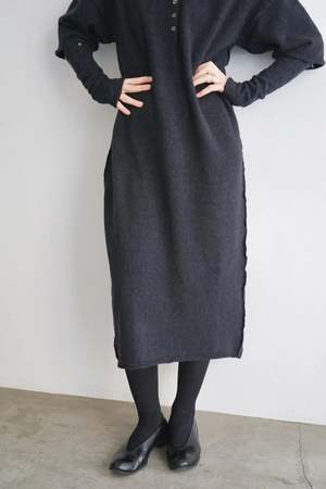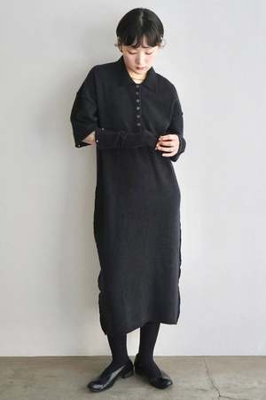 Loose-fitting polo dress knitted from a soft baby alpaca-cashmere blend. Features a relaxed, elongated silhouette with a ribbed pointed collar and buttoned front placket, short sleeves with detachable extended ribbed cuffs, exposed seams, and a rolled-edge hem. Versatile design, perfect layered or worn on its own. Italian yarn. 35% Baby Alpaca 35% Polyamide 15% Cashmere 13% Wool 2% Elastan. Made in Portugal.