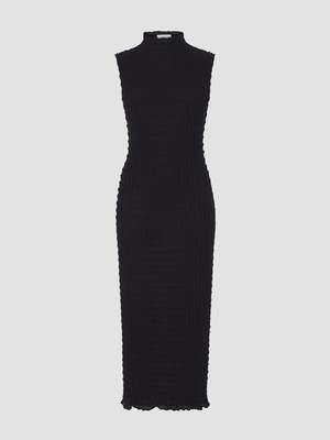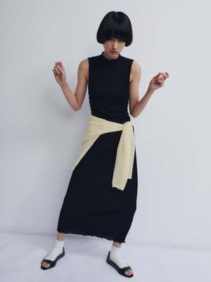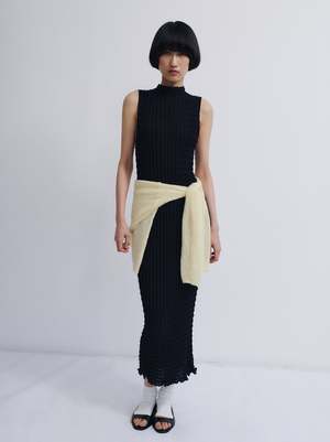 Lightweight sleeveless long dress crafted from an ultrafine Mak organic cotton blend with a dry handfeel. Knitted in a textured ribbed stitch that creates a pleated look all over. Elongated silhouette with a seamless mock neck and rolled trim. - Italian yarn: 82% Mak Organic Cotton, 18% Polyamidic Fibre - Made in Spain - Hand wash in cold water; dry flat - Glorietta is 174 cm tall and is wearing a size S Mak Cotton Cotton is one of the most comfortable and versatile everyday fibres. Its airy structure helps the body to regulate its own temperature, which makes it ideal for all seasons. Mak cotton is a high-quality long-staple fibre, cultivated and harvested in Upper Egypt, with the ability to be spun into a smoother, finer, and more resistant yarn compared to other cottons. Sleeveless pleated long dress in organic Mak cotton with a ribbed texture, mock neck, and seamless construction. Effortless elegance. Made in Spain.