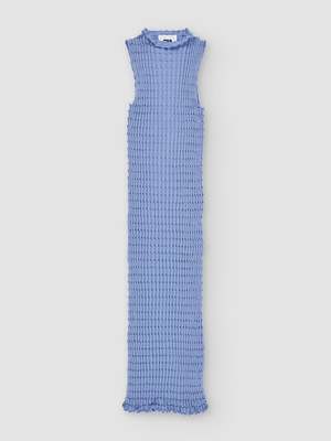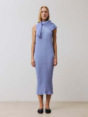 Pleated long sleeveless dress crafted from an ultrafine Mak organic cotton blend with a dry handfeel. Knitted in a textured ribbed stitch that creates a pleated look all over. Features an elongated silhouette and a seamless mock neck with a rolled trim. - Italian yarn: 82% Mak organic cotton, 18% polyamidic fibre - Made in Spain - Hand wash in cold water; dry flat - Celine is 178 cm tall and is wearing a size S Mak Cotton Cotton is one of the most comfortable and versatile everyday fibres. Its airy structure helps the body to regulate its own temperature, which makes it ideal for all seasons. Mak cotton is a high-quality long-staple fibre, cultivated and harvested in upper Egypt, with the ability to be spun into a smoother, finer, and more resistant yarn compared to other cottons.