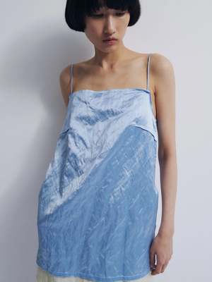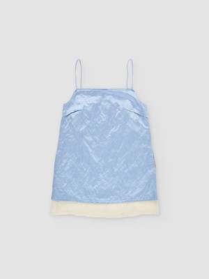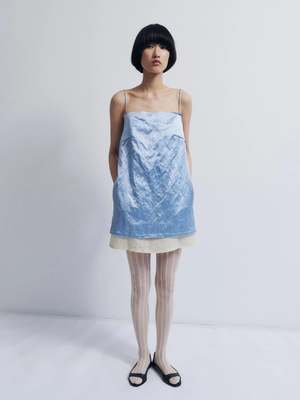 Layered mini dress crafted from satin with metallic fibers, giving it a subtle lived-in texture, paired with a textured linen inner layer. Features a straight neckline, spaghetti straps, side pockets, frayed edges at the neckline and hem, and exposed darts. The outer layer sits slightly shorter than the inner layer, creating a layered effect. - Italian fabric. Shell 55% viscose 38% cotton 7% metallic fibre / Lining 88% linen 12% recycled polyamide - Made in Spain
