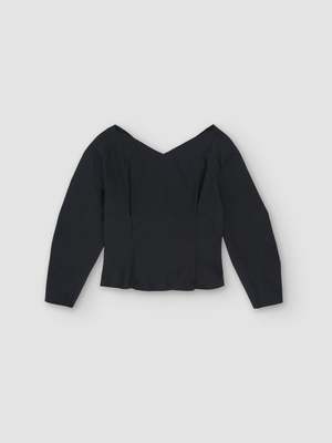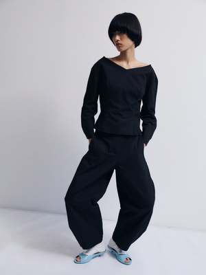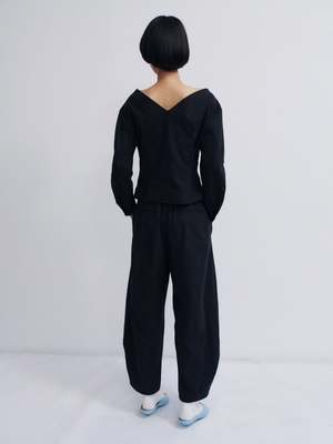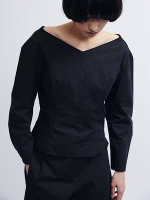 Open v-neck top Structured long-sleeve top with a wide raw-edged v-neckline at front and back, cinched waist with pleated darts, and curved, voluminous sleeves. Finished with an invisible side zipper for a seamless fit. For a complete set, wear with the Domu pants. - Italian fabric. 78% Cotton 22% Linen - Made in Spain - Machine washable. Max. 40C - Dhyani is 179cm tall and is wearing a size S
