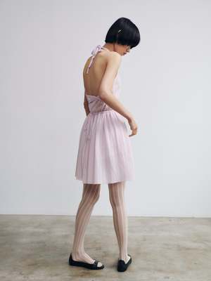 Wrap-around apron top in a fine striped jacquard crafted from ultrafine Mak cotton. Features a straight fit with a scoop neck, self-tie halter strap, and wrap construction with a self-tie closure. Finished with an open back and a slit detail at the back. Perfect for layering or to wear on its own. Italian yarn. 82% Mak cotton, 18% polyamide. Made in Portugal. Hand wash in cold water. Dry flat. Asako is 178 cm tall and is wearing a size S.
