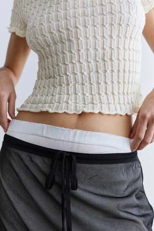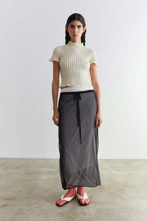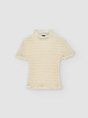 Short-sleeved fine-knit top crafted from an ultrafine Mak cotton blend with a dry handfeel. Features a textured ribbed stitch that creates an all-over pleated effect, a slightly cropped length, mock neck, rolled trims, and slim short sleeves. Made with Mak cotton, an extra-long-staple Egyptian cotton. These fibers are exceptionally strong and result in a luxuriously soft feel, creating lightweight, breathable fabrics perfect for warm weather. Made in Spain. Composition: - 82% Cotton Mak - 18% Polyamide Fit & Details: - Fit: Cropped - Length: Cropped - Neckline: Mock neck - Sleeve length: Short sleeve Mpn: 4000000017721