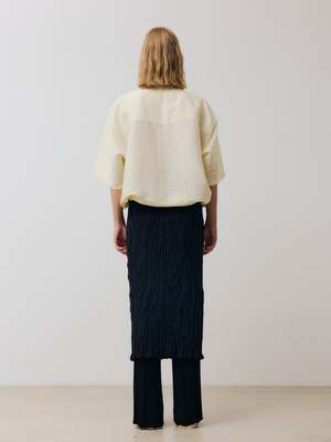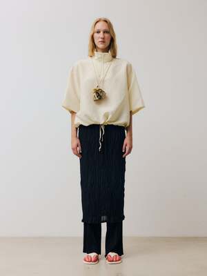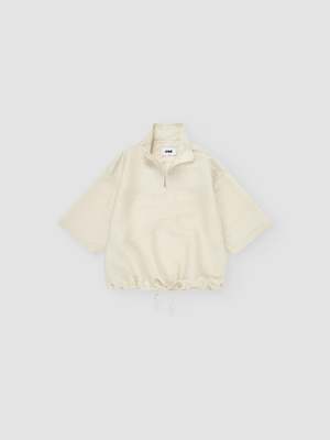 Short-sleeved half-zip top crafted from a lightweight textured Italian linen fabric. Features a relaxed, boxy silhouette with dropped shoulders and short, ample sleeves. Finished with a stand collar, half-zip closure, and an adjustable hem with ties. Italian fabric. 88% linen, 12% recycled polyamide. Made in Spain. Hand wash in cold water. Dry flat. Celine is 178 cm tall and is wearing a size M.