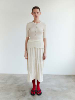 Buttoned ribbed top crafted from a fine organic cotton yarn. Features a buttoned front placket, skinny sleeves, exposed seams, and rolled trims. - Italian yarn. 92% Organic Cotton, 8% Polyamide - Made in Italy - Hand wash in cold water. Dry flat - Olha is 176 cm tall and is wearing a size S
