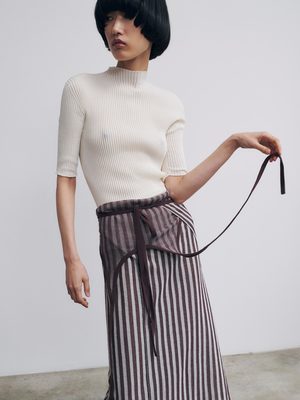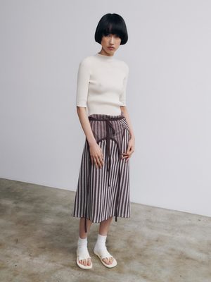 Striped wrap-around apron dress in a fine striped jacquard crafted from ultrafine Mak cotton. Features a straight fit with a scoop neck, self-tie halter strap, and wrap construction with a self-tie closure. Finished with an open back and a slit at the back. Perfect for layering or wearing on its own. - Italian yarn: 82% Mak cotton, 18% polyamide - Made in Portugal - Hand wash in cold water; dry flat - Celine is 178 cm tall and is wearing a size S