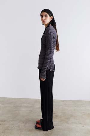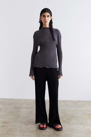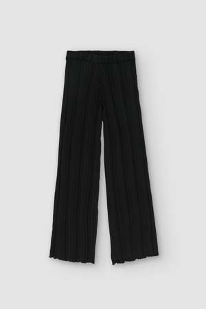 Straight-leg pants crafted from a responsible viscose blend in an irregular ribbed stitch that creates a pleated look all over. Relaxed fit with an elasticated waistband, mid rise, and ankle length. Made in Portugal. Materials: 75% Viscose, 25% Nylon. Founded in Galicia, Spain by sisters Pati and Ins, RUS is a knitwear-focused womenswear brand rooted in slow living, thoughtful consumption, and artistic expression. Produced in small, family-run workshops across Spain and Portugal using traceable, high-quality yarns and fabrics.