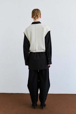 A buttoned vest crafted from a looped pile knit in a fine baby alpaca blend. It has a relaxed silhouette with a buttoned front placket and drop shoulders, featuring a puffed effect on the body with elasticated hems. Details: - Italian yarn - 48% Baby Alpaca, 27% Extrafine Merino Wool, 25% Recycled Nylon - Made in Portugal