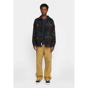 This shirt is made from a heavy-weight recycled polyester fabric with a brushed, warm surface. The geometric pattern in dark colors is inspired by ancient Aztec traditions, featuring rectangular and circular shapes arranged in long, symmetrical lines. The shirt includes a sharp-cut chest pocket, button-up front with tonal buttons, neck loop for easy hanging, adjustable cuffs for comfort, double-layer yoke, and a box-pleat center back for strength and mobility. Perfect for cold-weather everyday wear. 100% recycled polyester.