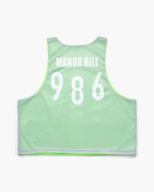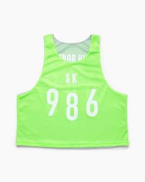 Cropped reversible jersey in grey and neon green mesh. Features graphics and is 100% polyester. Made in USA (New York Garment District).