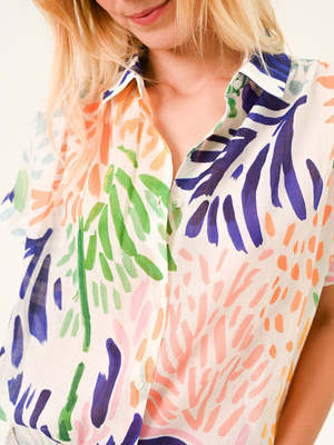 The Louisa Tropical Shirt in Aserri Multi from SACRECOEUR is a relaxed, everyday style crafted from 100% woven cotton. Designed with a classic collar and button-through front, it features a vibrant all-over tropical print for a fresh, playful finish. - 100% cotton - Long-sleeve shirt - Classic collar - Button-through front - Relaxed fit - Lightweight woven cotton fabric - All-over tropical print - Straight hem - Fits true to size