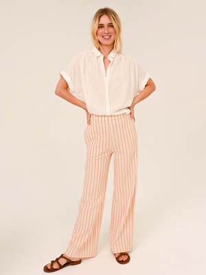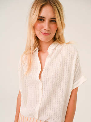 The Louisa Shirt in Pacora White from Sacrcoeur is a short-sleeved shirt in a woven criss-cross pattern. The shirt features a loose fit and flowing style, gathered at the shoulders and back, with cropped shoulders and turn-up cuffs, a classic shirt collar, and exposed buttons. - 60% cotton, 38% viscose, 1% polyester, 1% other fibres - Short sleeve casual shirt in a woven pattern - Classic shirt collar - Button closure - Turn-up cuffs