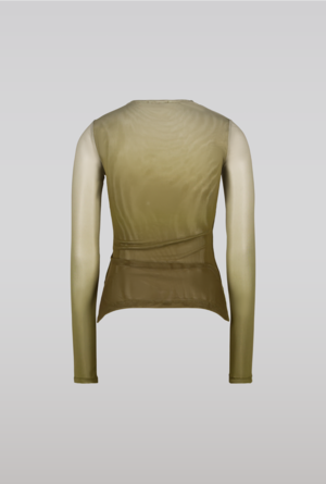 Fitted gradient mesh top with partial lining, asymmetrical neckline, knot detail at the waist, and side slits. This top is true to size. The model is wearing size S and is 175 cm tall. Material: 95% Polyester, 5% Elastane.