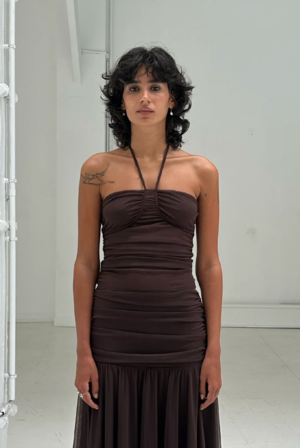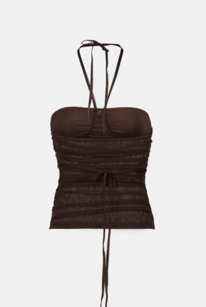 Semi-sheer mesh halterneck top with a softly draped silhouette and gathers at the sides. Halterneck straps are threaded through curved seams and tied at the back of the neck. This product is true to size. The model is wearing size S and is 170 cm tall. MATERIAL Self: 84% Polyester, 16% Spandex Lining: 88% Polyester, 12% Spandex