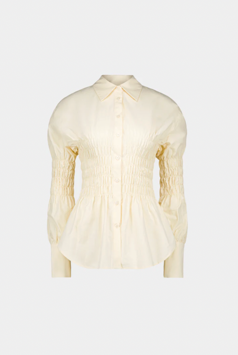 DESCRIPTION Fitted buttoned shirt with smock detailing through the mid-body and sleeves. This product is true to size. The model is wearing size S and is 170 cm. MATERIAL 100% Cotton