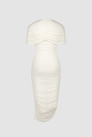 Fitted cream midi mesh dress with gathered sides and a draped removable cape. Removable slip dress. This product is true to size. The model is wearing size S and is 170 cm tall. Material 95% polyester, 5% spandex.