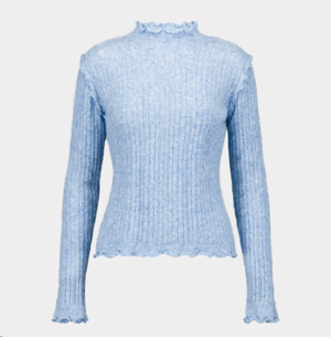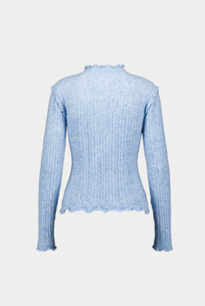 Soft and lightweight long-sleeved knit top with frill edges at the neckline, cuffs, and hems. This product is true to size. The model is wearing S and is 170 cm tall. 95% polyester, 5% spandex.