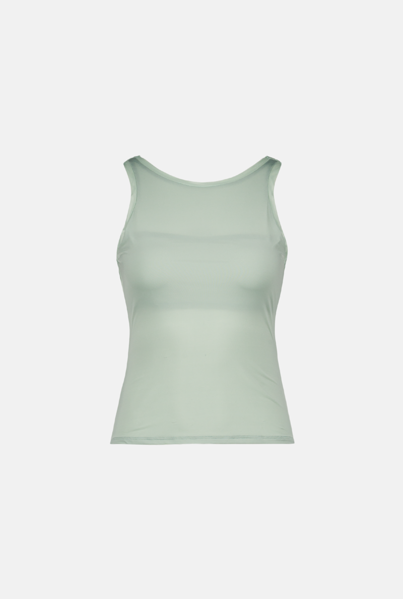 Teal sporty tank top in slinky jersey with mesh trim and sheer mesh side panels. This product is true to size. The model is wearing size S and is 170 cm. MATERIAL Self: 84% Polyester 16% Spandex Trim: 88% Polyester 12% Spandex