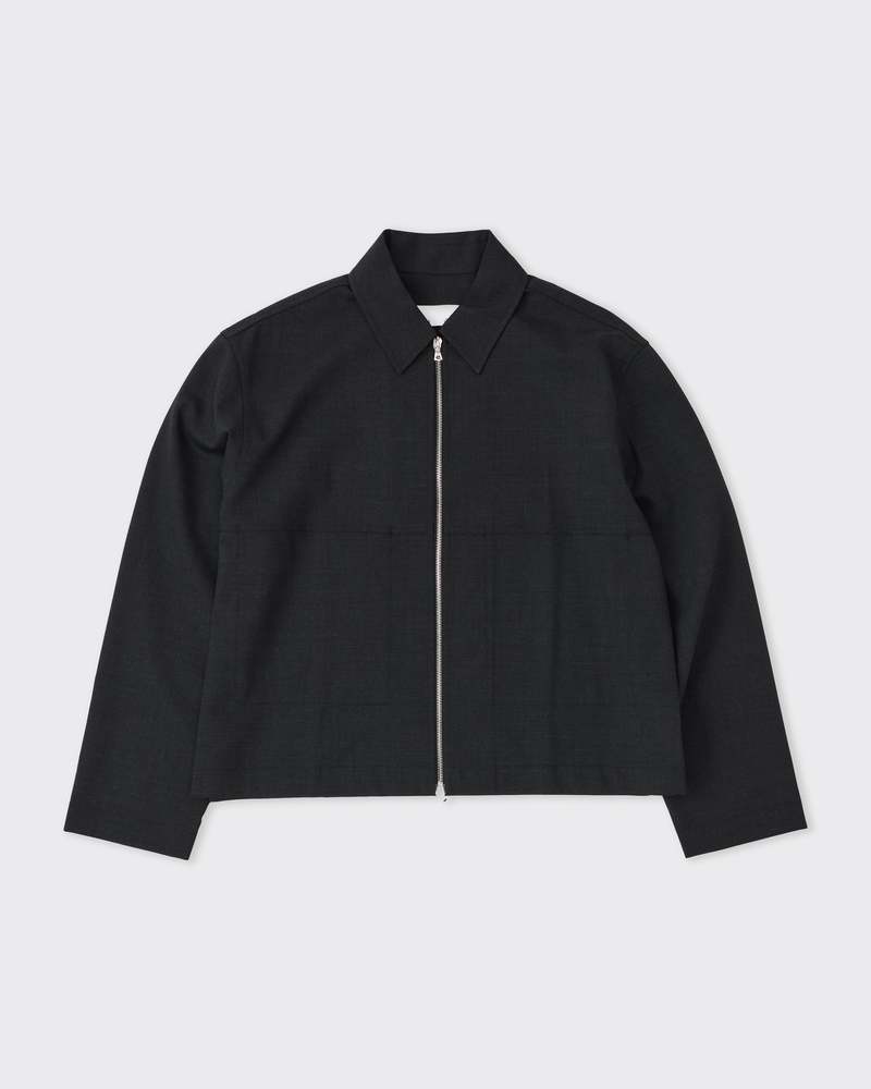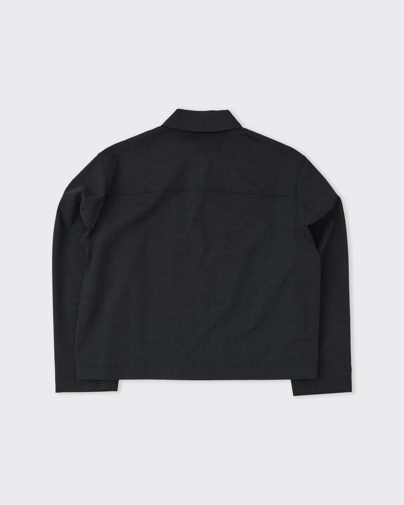 A boxy shirt jacket with a zip closure, cut from a tropical-weight wool blend in charcoal. The fabric has a clean surface with just enough stretch from the Lycra content to keep things comfortable through movement. A versatile layering piece that sits between a shirt and a jacket. Made in England. Details - Boxy fit - Full zip closure - Tropical wool blend Fabric 54% Polyester, 44% Wool, 2% Lycra.
