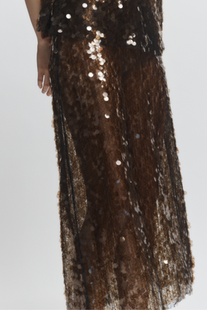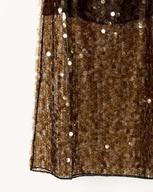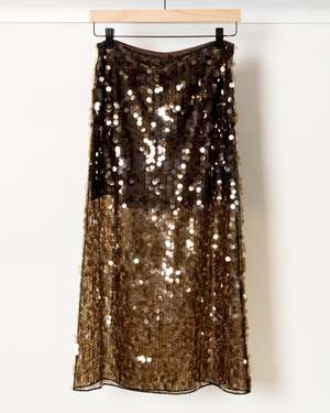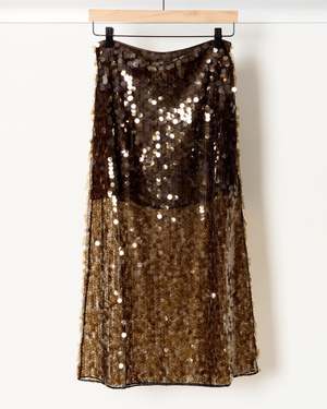 Shimmering and sophisticated, the Ivy Sequin Mesh Skirt from Saint Art features lightweight mesh embroidered with allover sequins for radiant movement. Midi length with a subtle A-line silhouette for graceful drape. Half skirt lining ensures comfort while maintaining an airy, semi-sheer effect. Elasticized waistband for a smooth, flexible fit. Shell: 100% Polyester. Lining: 95% Polyester, 5% Spandex.