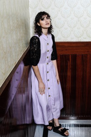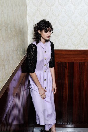 This linen with viscose and lace blend dress drapes beautifully. It buttons on both sides of these beautiful contrasting lace sleeves and also It buttoned up from its classic straight point collar up all the way to the hem which gives this dress a more relaxed fit. It features a slightly puffed sleeves that drapes beautifully on the shoulder and a flattering waist that accentuates the body of the wearer. Model is wearing a size Small. SCARLET DRESS - BLACK LINEN / BLACK LACE