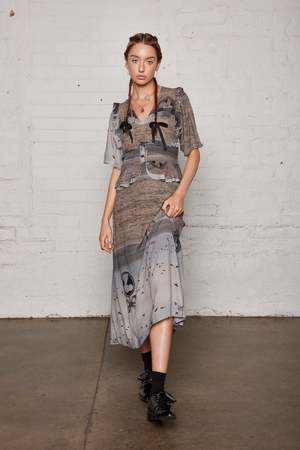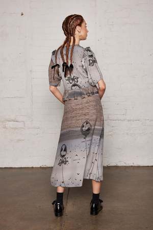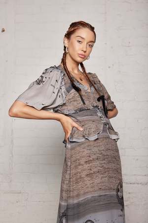 Homage to Salasai's signature, an overlay of meaning & themes, mixing genres to create beautiful disruption. Featuring our season's SS24 print in nostalgic cameos overlaying an airy sea backdrop of dulled blues & greys. The Sea Scape print. This dress features a charming sweetheart ruffled bodice detailing, a short puffed mid length sleeves and stunning peplum waist detailing that finishes with beautiful frills in an A line skirt silhouette. This is a very flattering style on most body type and Salasai's key dress shape of the season. Made in 100% Viscose and printed with non toxic water based inks. We are committed to working with our makers to source low-carbon materials, which significantly reduces the carbon footprint of our pieces. Note: The garment's print is differently placed, each piece cut individually. The model is wearing an original print and not two are the same. Model's Height is 175cm/5'9" She's wearing a size Extra Small.