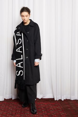SAMPLE ITEM: - The first time in Salasai history we have made samples available for sale. ** Note samples may have been worn in a show or in a look book shoot Wide 100% merino scarf with text that reads SALASAI SILENCIO. Tassels at each end - a bold statement warm luxe accessory to wear.