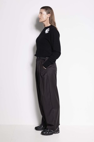 EAST ELEMENT PANT IN BLACK PINSTRIPE Introducing our East Element Pant in Black Pinstripe a wardrobe staple designed for those who appreciate both comfort and style. Featuring side pockets and back welt detailing, these trousers combine practicality with elegance. The side pockets add a casual and functional element, while the back welt design enhances the overall tailored look. Crafted with attention to detail, these trousers are made for all-day wear, ensuring you stay comfortable and stylish from morning to night. Pair them with a crisp shirt for a professional look or dress them down with a casual top for a laid-back vibe. We are committed to working with our makers to source low-carbon materials, which significantly reduces the carbon footprint of our pieces. Made from Fine Wool Suiting Rachel is wearing a size XS