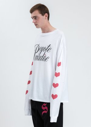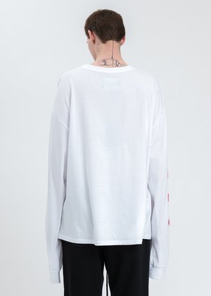 White oversized long sleeve T-shirt. Features a black text print across the chest. Red heart detailing along either sleeve. Finished with a rib-knit crew neck collar, and rib-knit cuffs. Tonal stitching throughout. Relaxed Fit 100% Organic Cotton Made in Canada Model is wearing a size S Model is 6 (183 cm), 125 pounds (56 kg), usually wears M in tops. A size 29 in denim and 46 in trousers. Size 10 in shoes.