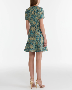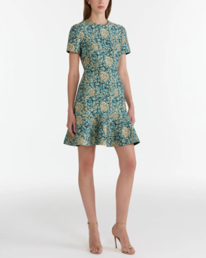 Combining sleek tailoring with romantic details, the Min-D Dress embodies SALONIs ethos of pieces that offer effortless yet timeless sophistication. The dress features a structured collar and short sleeves, while the flounce hem skirt adds a playful finish with its soft movement. A delicate rose motif blooms across the rich brocade, lending the dress an air of timeless sophistication. The perfect balance of elegance and ease, wear with heels and a clutch for a polished look. 100% Silk Dry clean only. Avoid contact with suntan lotion/oils and with harsh chemicals.