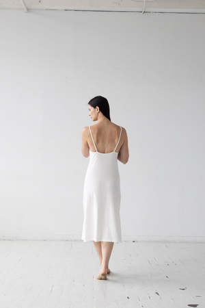 This ultra-soft, long, bias-cut nightgown is crafted from brushed Pima cotton, known for its luxurious texture and gentle touch against the skin. The gown features delicate spaghetti straps that provide a barely-there feel. Its bias cut allows it to gracefully skim the body's natural curves, adding a fluid, flattering silhouette that moves elegantly. The brushed finish on the Pima cotton gives it an extra layer of warmth and softness, making it perfect for cozy, restful nights. Length from shoulders: 44 in Proudly made in Colombia.