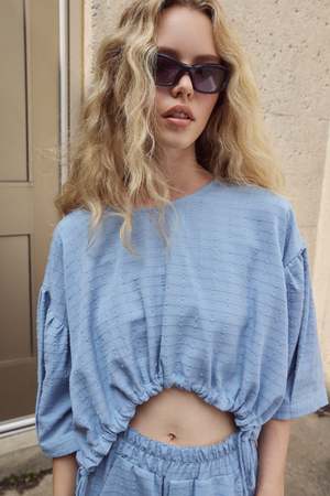Short round-neck blouse with a tied back an Eve Gravel signature. This casual yet refined top features an open back with ties that create a soft arched effect. It is a 2-in-1 style that can be worn with the bow in front and the button placket at the back, or reversed to change up the look. Designed and made in Montreal, Canada. Composition 50% Cotton, 46% Rayon, 4% Linen. Care Machine wash on delicate cycle in cold water with similar colors. Hang to dry. Iron inside out on low temperature. Model Luca is 5'6" and wears size S.