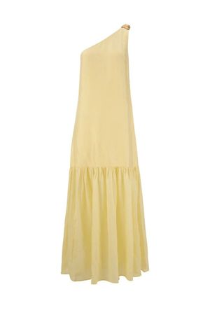 Making a statement with its asymmetric neckline, gold embellishment, and sheer skirt panel, the Claudia Dress is a true embodiment of elegance and femininity. Style it with heels and a small bag for a showstopping look. DETAILS: - Maxi length - Asymmetric neckline - One-shoulder silhouette - Detachable brushed gold brooch - Dropped waistline - Sheer skirt panel - Side seam zipper - Bodice lined with 100% rayon FABRIC & CARE: - Shell: 60% Cupro, 40% Viscose - Lining: 100% Rayon (bodice) - Gentle hand wash - Cold water only - Do not tumble dry - Do not bleach or soak - Line dry in shade - Warm iron - Dry cleanable SIZE & FIT: - Fits true to size - Models are wearing a size XS - For detailed sizing, please refer to the garment measurements in the size guide below (measurements in cm). This style is made-to-order and Final Sale.