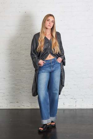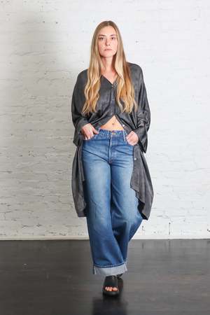 Made of heavy viscose satin with a unique hand-shaded effect and washed batik details. Care: Hand wash cold. Do not bleach. Do not tumble dry. Dry flat. Color: Emerald Grey. Fit: Take your true size.