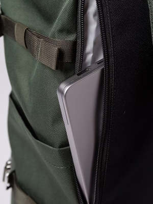 The Icon Rolltop Backpack from Sandqvist is a versatile, lightweight everyday companion that combines minimalist design with practical functionality. Perfect for commuting, outdoor adventures, or daily errands, this water-resistant backpack offers ample storage with its 26-litre capacity. Features a dedicated external laptop pocket that fits devices up to 16 inches, secure rolltop closure with zipper and metal buckle, and internal mesh pocket for small essentials. Two external slip pockets and adjustable side straps provide additional storage options. Designed for comfort with a padded backplate and adjustable shoulder straps. Crafted from recycled polyester with leather details and metal buckles for a timeless look.