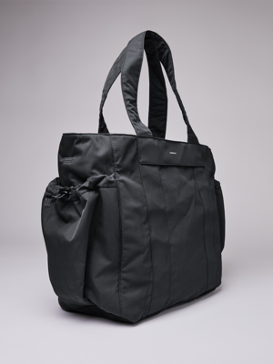 Spacious tote bag in crinkled twill made from 100% recycled nylon, constructed with a soft padding. The bag features outer slip pockets for water bottles or other essentials. Also available in Lichen Green.