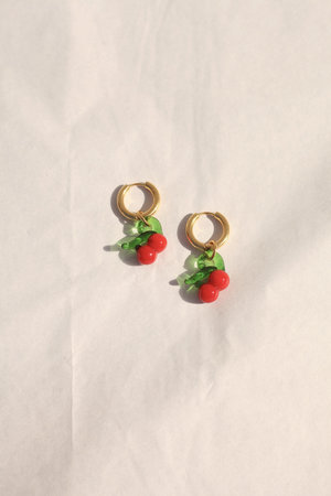 A pair of small hoop earrings with a cherry drop. The glass charm is detachable. Sandra Alexandra - Red - 100% glass and gold plated brass