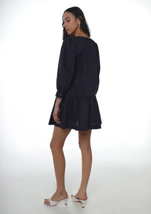 The Delia Dress by Sandy Liang is a long-sleeved cotton mini dress in navy. It features a bow detail at the neckline, a relaxed fit at the bodice, and Mother of Pearl buttons at the front. Made from 100% cotton. Fits true to size. Size measurements: XS: Length 32 1/2", Chest 35 1/2", Waist 39 1/2" S: Length 32 3/4", Chest 37 1/2", Waist 41 1/2" M: Length 33 1/4", Chest 39 1/2", Waist 43 1/2" L: Length 33 3/4", Chest 41 1/2", Waist 45 1/2" XL: Length 34 1/4", Chest 44 1/2", Waist 48 1/2".