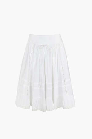 Sandy Liang Calico Skirt in White - Mid length Cotton skirt in White - Features a yoke construction with eye trims - Concealed zipper at side Sits at hip - Fits true to size - Fabric: 100% Cotton - 2: Length 24 1 / 4", Waist 28", Hip 32 1 / 2" - 4: Length 24 1 / 4", Waist 29", Hip 33 1 / 2" - 6: Length 24 1 / 4", Waist 30", Hip 34 1 / 2"