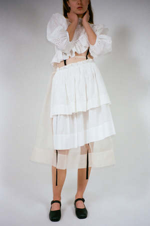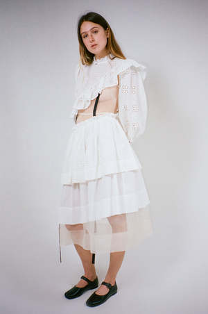 By Sandy Liang Tiered organza and cotton eyelet long dress in White Eyelet Concealed tonal zipper at center back Three-quarter length puff sleeves with ventilated underarm cutouts Ruffle details throughout Measures 47 1 / 2" long