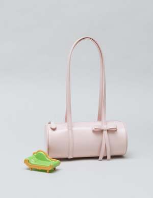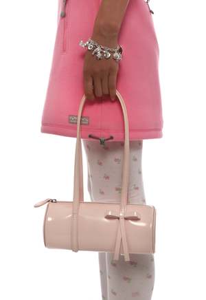 A barrel shoulder bag from Sandy Liang inspired by childhood pencil cases. Made in a special Specchio Leather in Pale Pink. Dimensions: W9.5" x H4" x D4", 11" strap drop. Composition: 100% Specchio Leather. Imported.