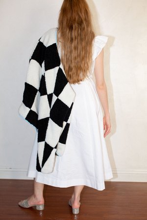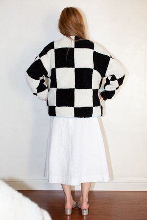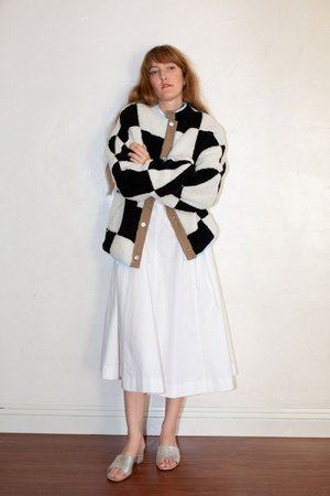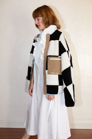 Sandy Liang Pawn Fleece in Checkerboard - Signature collarless unisex fleece shape - Features checkered pattern all over - Made with fleece sourced from Italy - Pistachio zippers at pockets - Baby blue binding and lining - Fits slightly oversized or order a size down from your normal outerwear size for a more fitted look. - Kourtney is wearing size XS