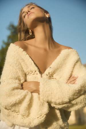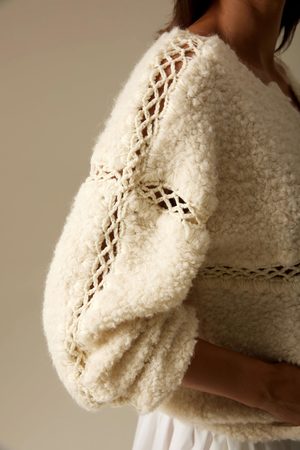 Knitted in a technique that emulates the texture of lamb fur, the Irina cardigan is light, warm and incredibly soft. The sweater is detailed with beautiful hand crochet details crafted by women in Transylvania. Pockets and a front placket closing with snaps add a functional touch to this perfect spring cardigan. Fit: Bianca, our model is 5.8 or 1.77 m tall and wears size 1. Body: 36% Alpaca + 14% Wool + 40% Polyacrylic + 10% Polyamide Contrast: 50% Merino Wool + 50% Polyacrylic Care instructions: - For easy care, professional dry cleaning is recommended. Yarn source: Italy. Made in a family-owned factory in Romania.