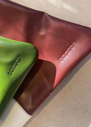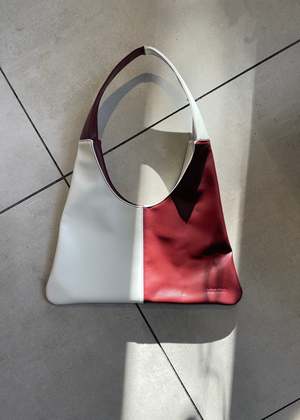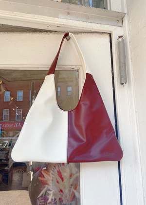- Burgundy & white triangular tote bag - Cactus leather, cotton lining - Smooth patent-like cactus leather - Interior slip pocket SIZE NOTES - Height: 18.1" - Strap Drop: 11" - Width: 14.6" SUSTAINABLY MADE - From Santos by Monica (New York, NY ) - Handmade in NYC - In collaboration with Desserto, their plant-based leather is crafted from cactus fibers and made in Mexico. - Sustainable Values: #3: Sustainable materials, #4: Natural and organic ingredients, #7: Safe, livable, dignified employment, #9: No animal cruelty SUSTAINABLE CARE - We recommend wiping regularly with a soft, dry cloth. Avoid contact with grease, dirt and rough surfaces. While these handbags are designed to be durable, try not to overload your bags capacity. - Please note that the cactus-based biomaterial is water resistant, but not waterproof. It is also heat resistant, but as with any natural fiber, it should not be subjected to temperatures above 248F (120C) over long periods of time. - Extra care should be taken to protect light colored handbags. Avoid exposure to extreme sunlight and humidity.