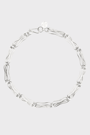 By Sapir Bachar Poetic visualization of an ethereal phenomenon. New custom elements aligned together in pairs and rows - creating this ultra-shiny, three-dimensional piece. 925 recycled sterling silver Approx. length 36cm Polished finish Comes in signature organic white twill pouch with black leather cord