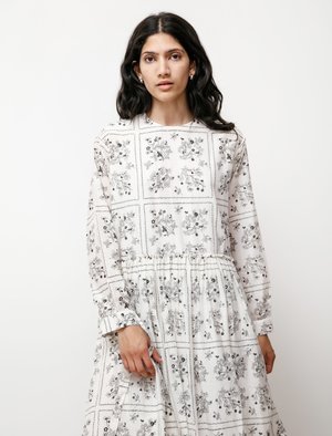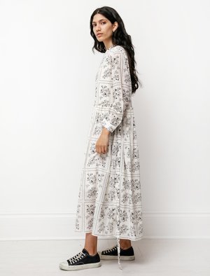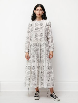 Adorned with the sweetest wild berry motif throughout, this dress is cut from Sara Lanzi's staple cotton, silk and wool blend that floats like air around the body. Its ethereal drape is accompanied by a generous tie at the waist that allows you to play with its silhouette. Pockets on any dress make us love it just a little more and for this number theyre the cherry on top. - Made in Italy - 52% cotton, 26% silk, 22% wool - Dry clean only - Fits true to size - Jiya is 59; bust 33; waist 24; hips 35; wears a size small