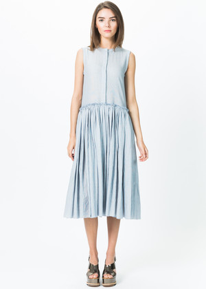 Sara Lanzi's light weight, blue and white yarn dyed cotton oversized dress features a full gathered skirt with exposed raw waist seam. Details - Crew neck. Finished raw armhole and neck seams. Hidden on-seam pockets. - Half button front closure. Gathered skirt. Oversized fit. Sleeveless. - Hidden button placket with decorative top stitching. - 14" shoulder, 18" chest, 45" back length (approximately). - Dry Clean Only. - Made in Italy Color light blue. 100% cotton. Dress runs true to size with fitted upper and full skirt. Model is wearing a x-small, Megan is 5'7", 35" hip, 24" waist.